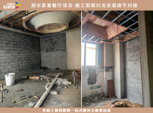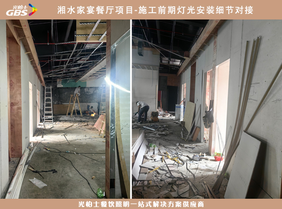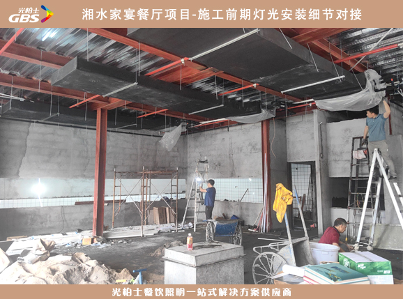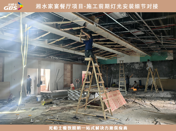 湘水家宴餐厅项目施工现场,天花封板准备完工,